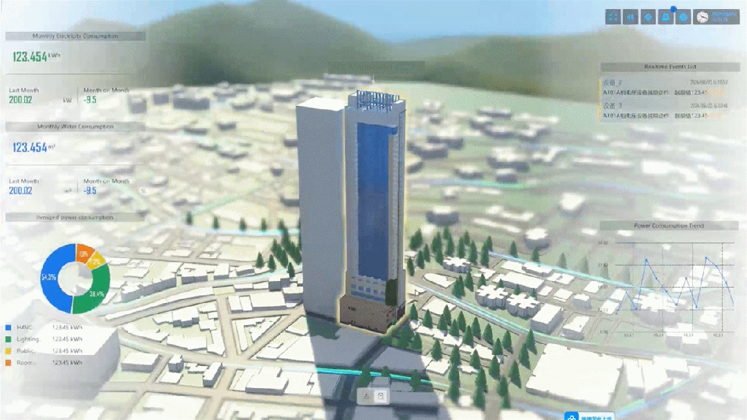 在建筑与市政领域,通过深度融合web 3D开发建模、AI和图形图像技术,深度还原楼层的空间布局,并集成电力、空调BA、智能照明、给排水、车辆、门禁等系统,真实还原场景并接入数据和数量,让复杂的建筑运营管理流程和设备运行数据在大屏上直观呈现。通过平台智能预警即可实现设备的报警定位、工单推送等功能,达到监控、管理、运维于一体,实现能源系统的动态监控和数字化管理。