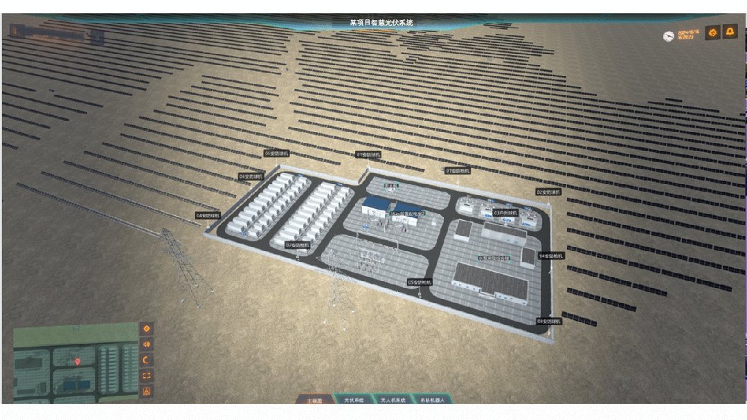在新能源发电领域,针对光伏电站面积辽阔、地形起伏等特点,通过对光伏电站的精细化建模与仿真,全方位展示整个光伏电站的运行情况,包含市电供电、光伏发电、储能充放电、充电桩、负荷用电等信息,助力光伏电站实现能效精准管理、远程集中监控、区域共享服务、场站无人值守的目标。
