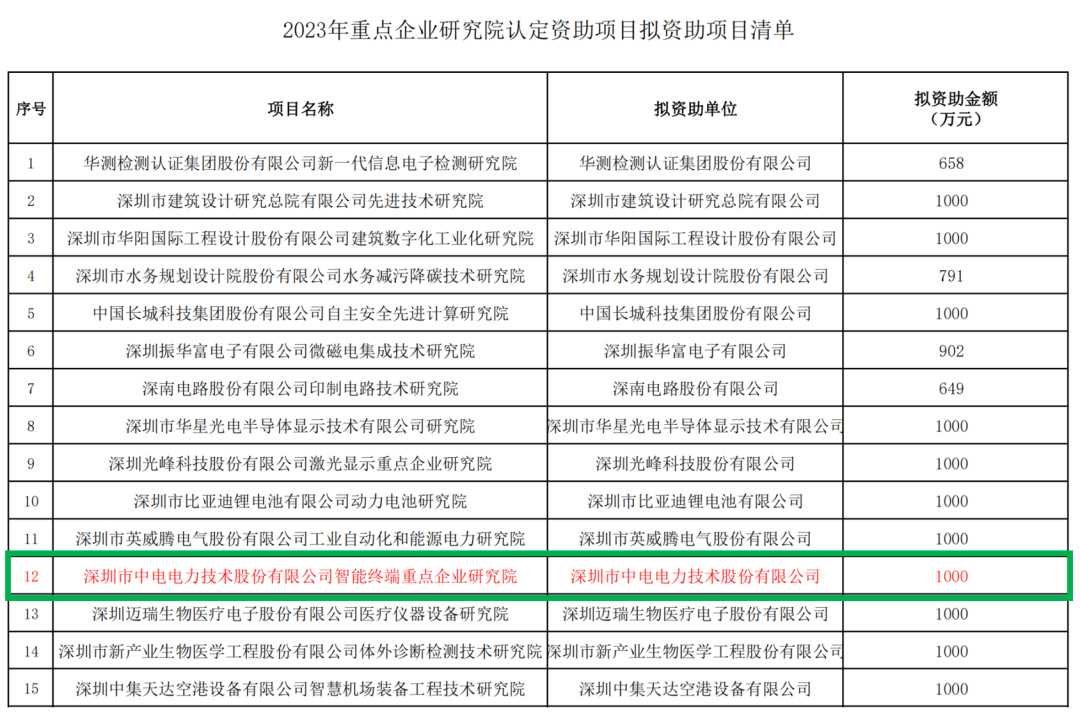 CET中电技术智能装置研发中心申请的“智能终端重点企业研究院”经过深圳市科技创新委员会组织的专家评审、现场考察和公示,获得2023年度深圳市重点企业研究院认定和1000万资助。