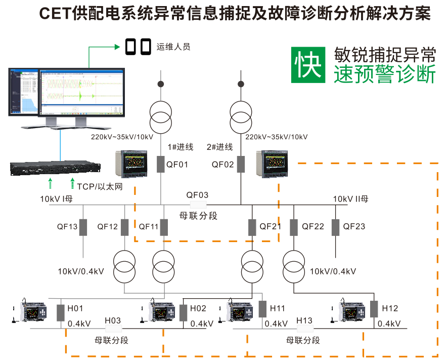 变电所电力监控系统可实现微机保护、全电量采集、电能质量监测、分时计费、故障诊断、波形瞬态捕捉、能源管理、智能化低压电动机保护控制等功能,提高供配电系统的可靠性及自动化水平。