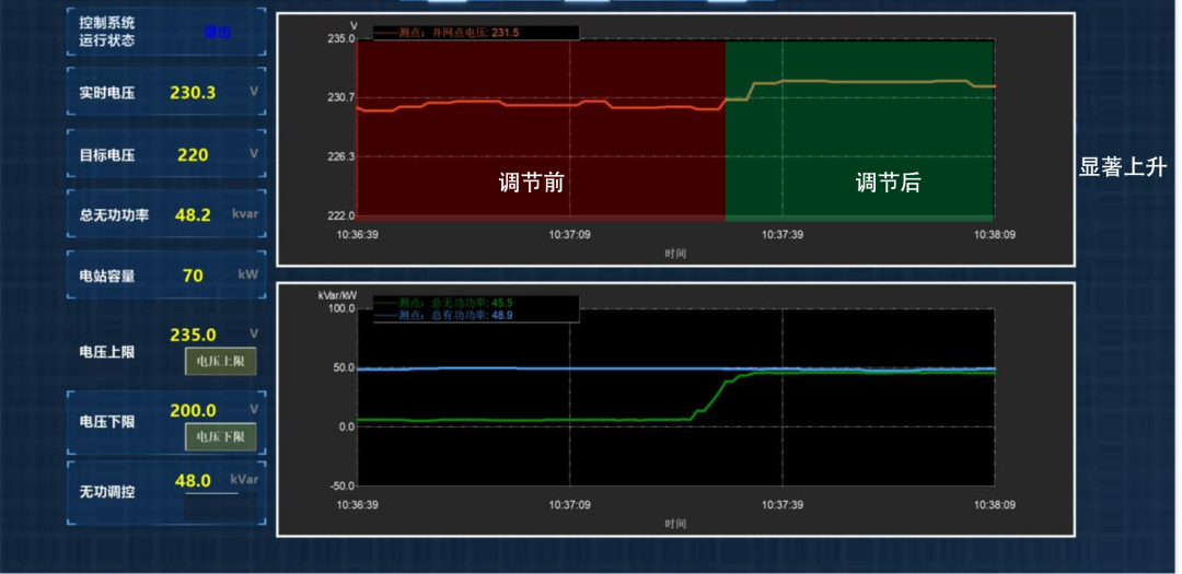 通过控制逆变器以最大正向无功功率输出时,明显提升并网点电压。