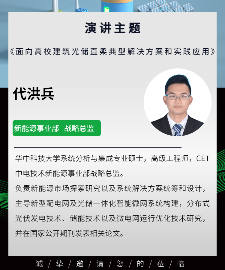 年会上,CET中电技术新能源事业部战略总监代洪兵将发表《CET面向高校建筑光储直柔典型解决方案和实践应用》专题演讲,与您探讨通过搭建光储直柔综合管理控制系统,如何使建筑从电能的“消费者”转变为“供能者”。
