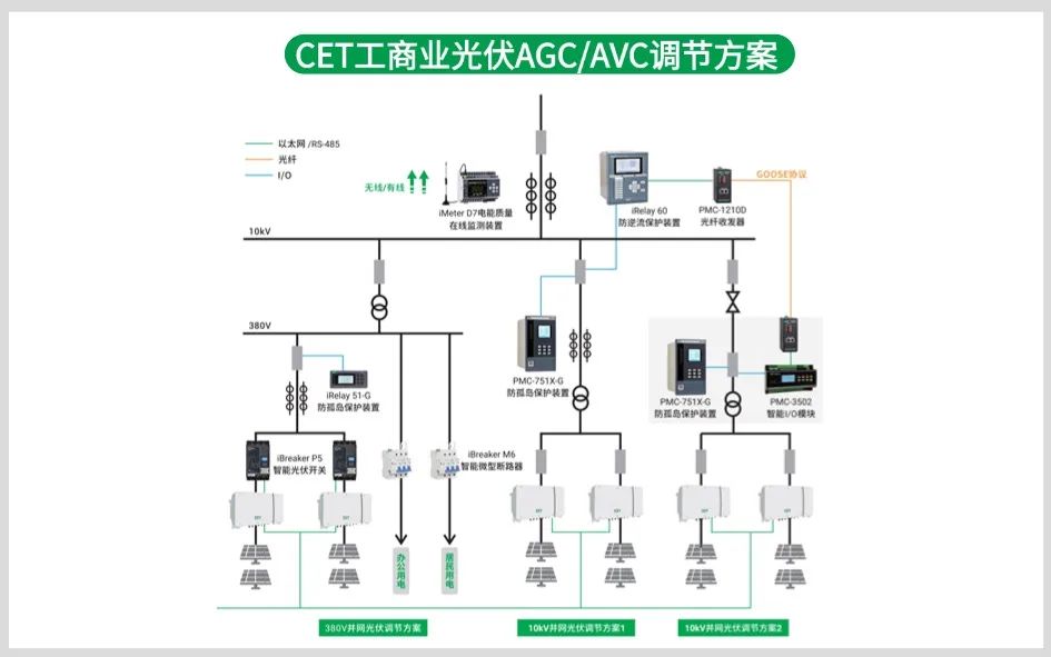 方案以安全、经济、高效、低碳为核心设计原则,将各项目市电供电、光伏发电、储能充放电、充电桩运行、负荷用电、以及光伏电站运行节能减排等信息进行集中采集和分析,实现信息化、自动化、智能化的智慧能源服务。通过可视化在线监测、智能数据分析等技术,实现对光伏电站的无人巡检、智能图像识别、光伏发电智慧分析,助力电站提质增效,确保电站安全、可靠运行。PMC-1606虚拟电厂控制终端具备接收和执行电力调度机构控制和调节指令的能力,满足电网运行“可观、可测、可调、可控”要求,具备微电网自治能力,可用于防逆流及功率因数治理等场景。故障解列、防孤岛、电能质量监测作为光伏并网的“三剑客”,可有效保护电网安全稳定运行,如iRealay 60综合保护测控装置、iRealay-51-G防孤岛保护装置的逆功率保护功能可用于大型工商业光伏、储能电站的防逆流场景。