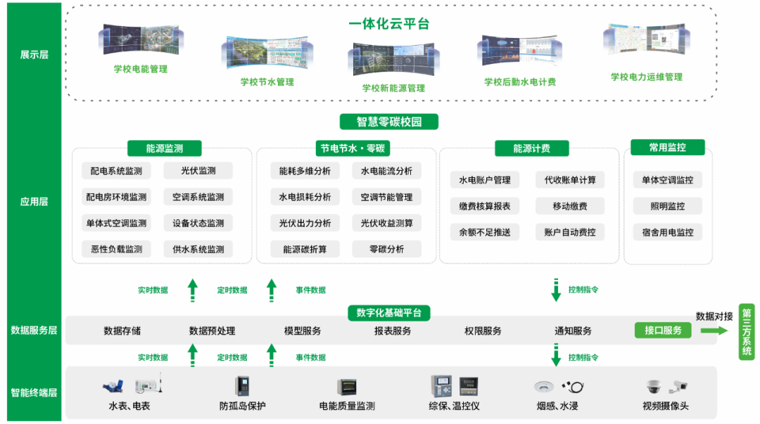 方案可实现电力系统智能电能与其它智能终端数据灵活接入,使数据互通互联,对电力系统实现定时通断电、恶性负载识别、异常警告等功能,消除校园电力安全隐患。
